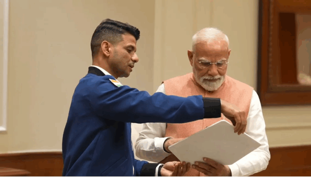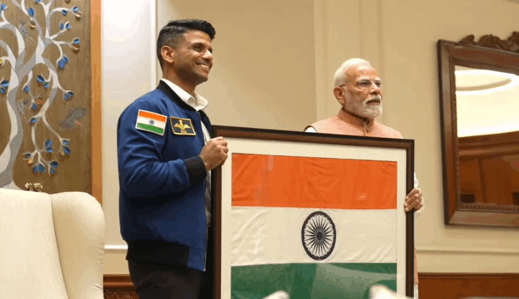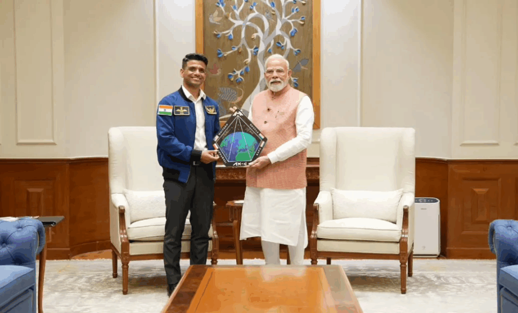 शुक्ला ने प्रधानमंत्री से लोक कल्याण मार्ग स्थित उनके आवास पर मुलाकात की। मोदी ने इसरो अंतरिक्ष यात्री की जैकेट पहने शुक्ला को गर्मजोशी से गले लगाकर उनका स्वागत किया और उनके कंधे पर हाथ रखकर उनके साथ चले। शुक्ला ने प्रधानमंत्री को ‘एक्सिओम-4 मिशन’ का ‘मिशन पैच’ और वह भारतीय तिरंगा भेंट किया, जो वह अपने साथ आईएसएस ले गए थे। जब शुक्ला और मोदी ने 29 जून को बातचीत की थी, तब आईएसएस पर पृष्ठभूमि में यह भारतीय तिरंगा लहरा रहा था।